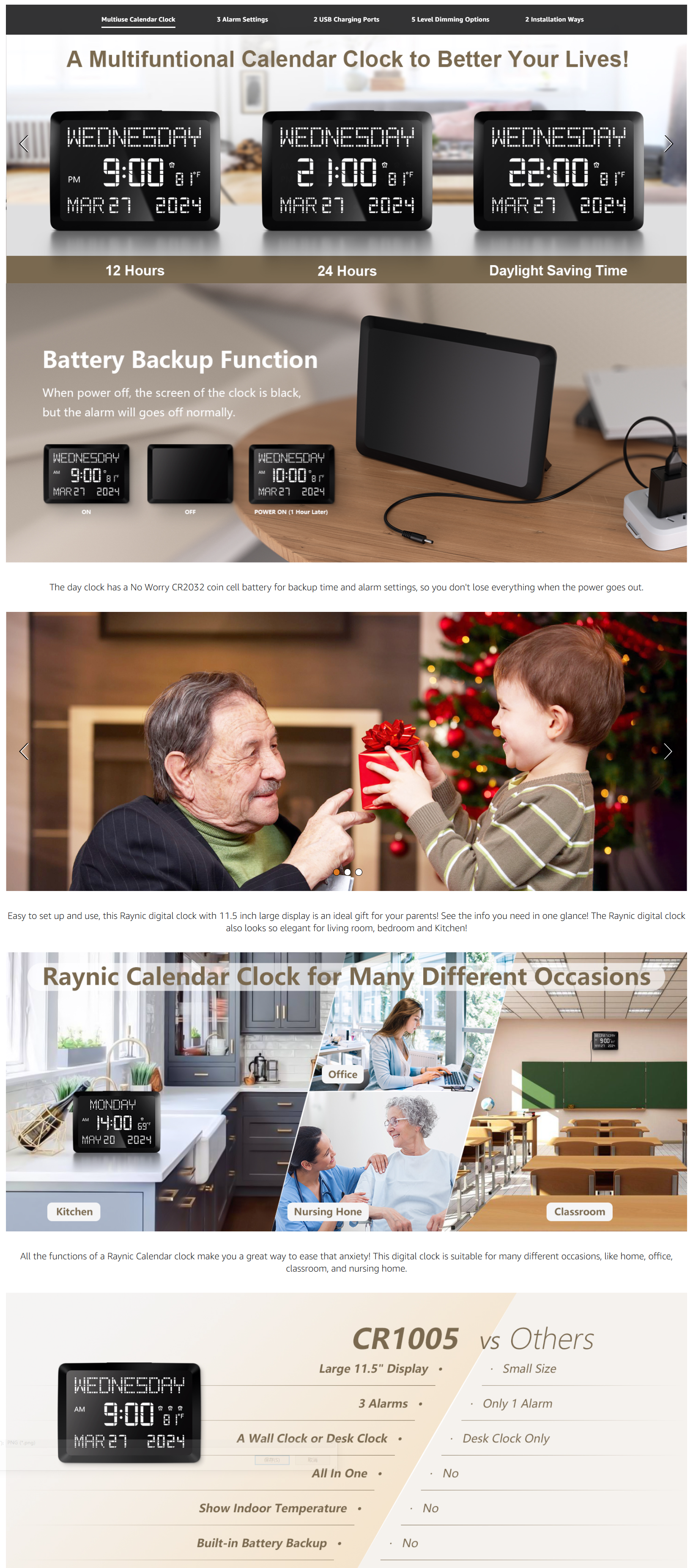Raynic Digital Clock, 11.5" Large Display Calendar Clock with Day and Date, Indoor Temperature
